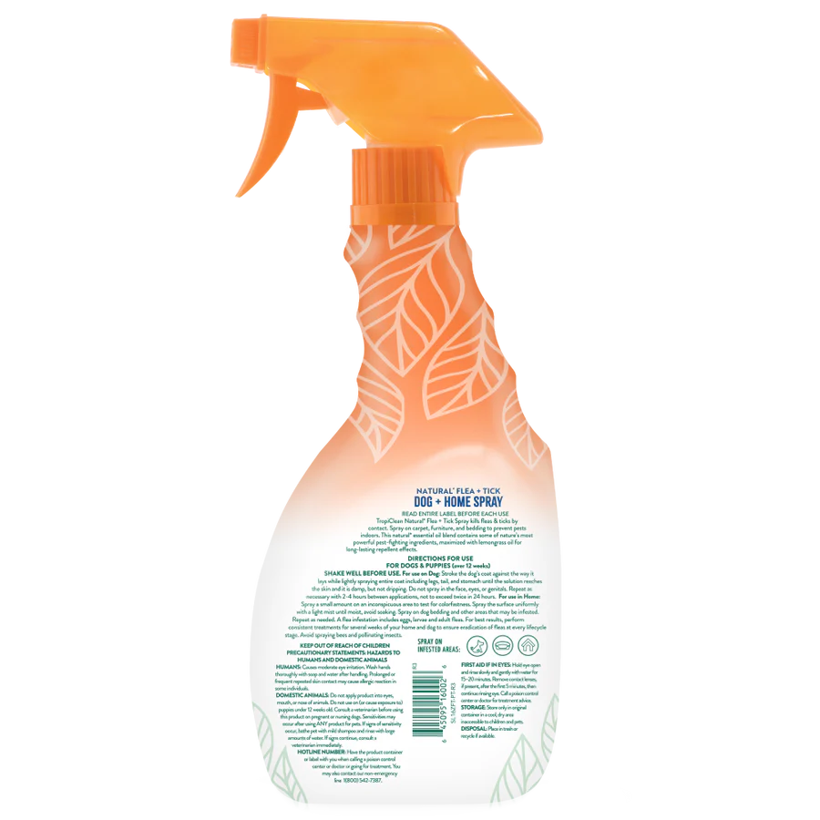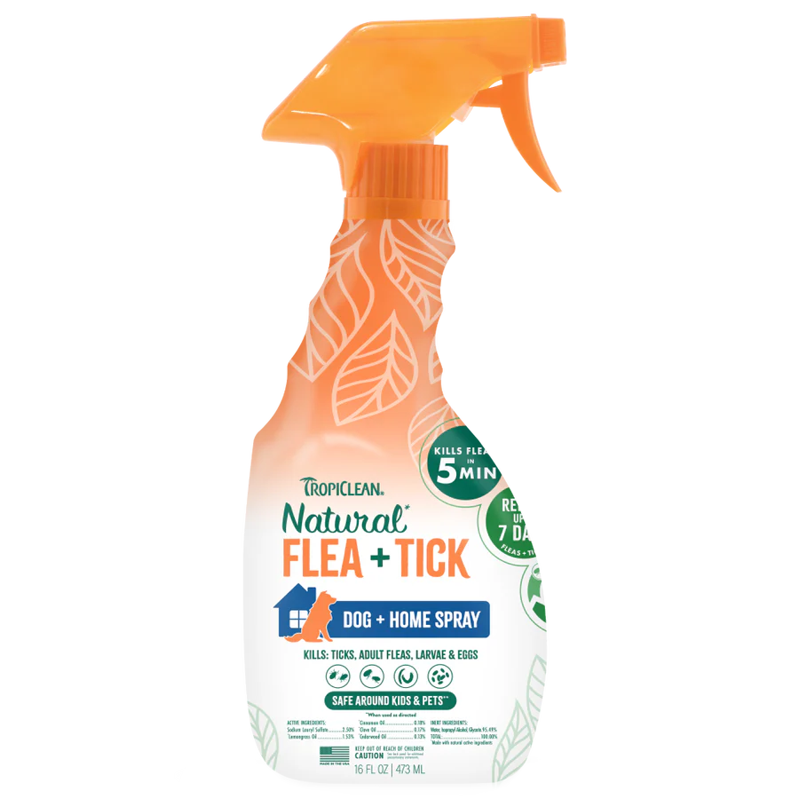 No content found.תרסיס Tropiclean קוטל פרעושים וקרציות טבעי, מכיל למון גראס ושמן שומשום.