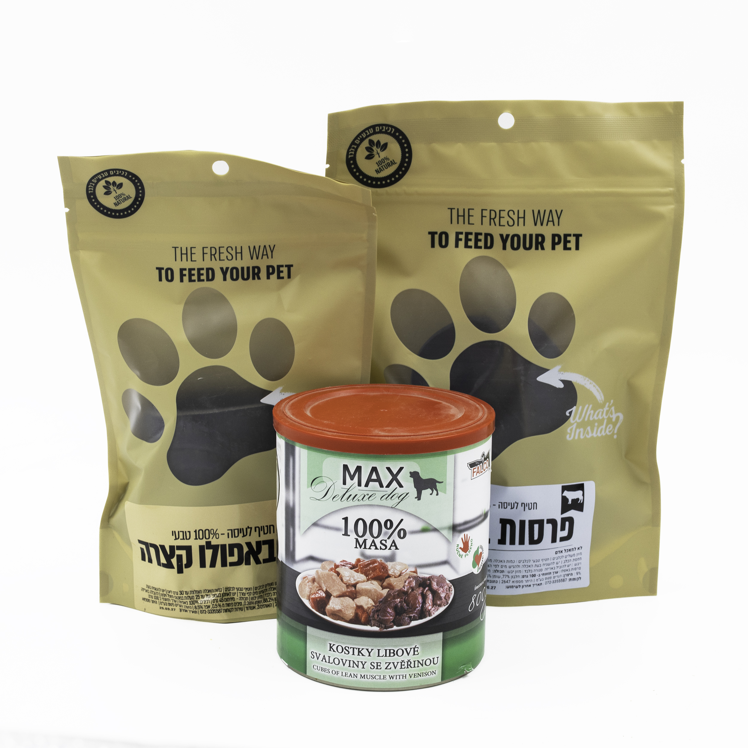 הערכה כוללת 3 פרסות בופאלו משויפות של חברת הנריס, קרן בופאלו קצרה למילוי ומזון טבעי איכותי 800 גרם.