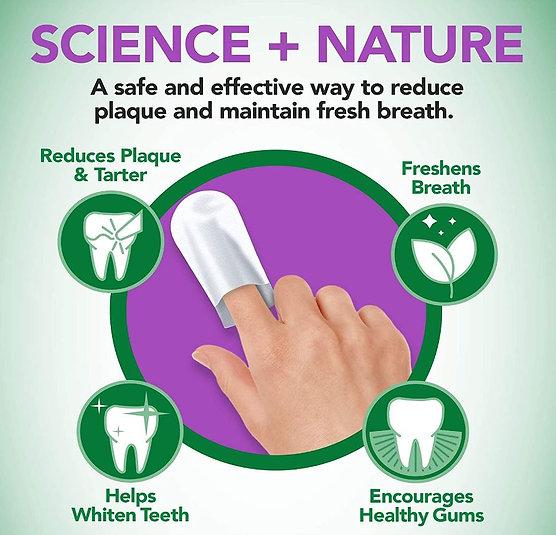 המגבונים עוזרים להסיר פלאק (רובד חיידקים), מפחיתים ריח רע, ומונעים הצטברות אבנית, ומגיעים באריזה של 50 יחידות.